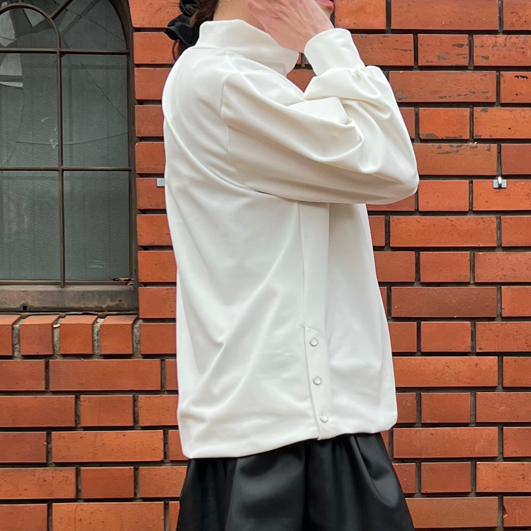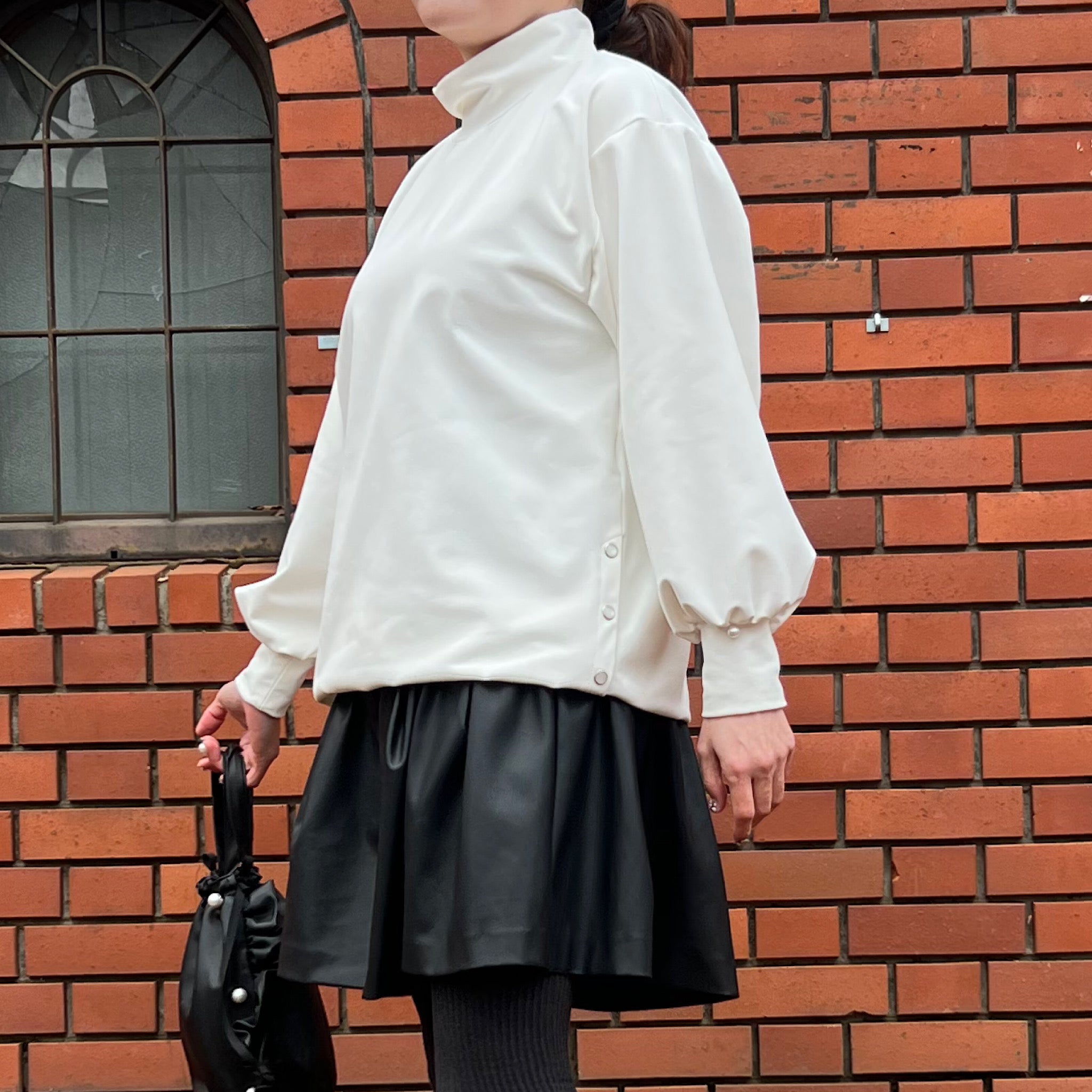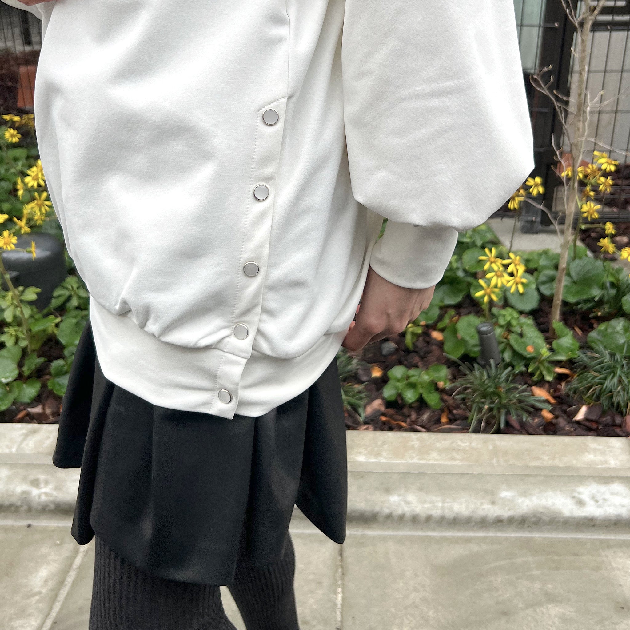 両脇にはパールモチーフのスナップボタンを配置し、
