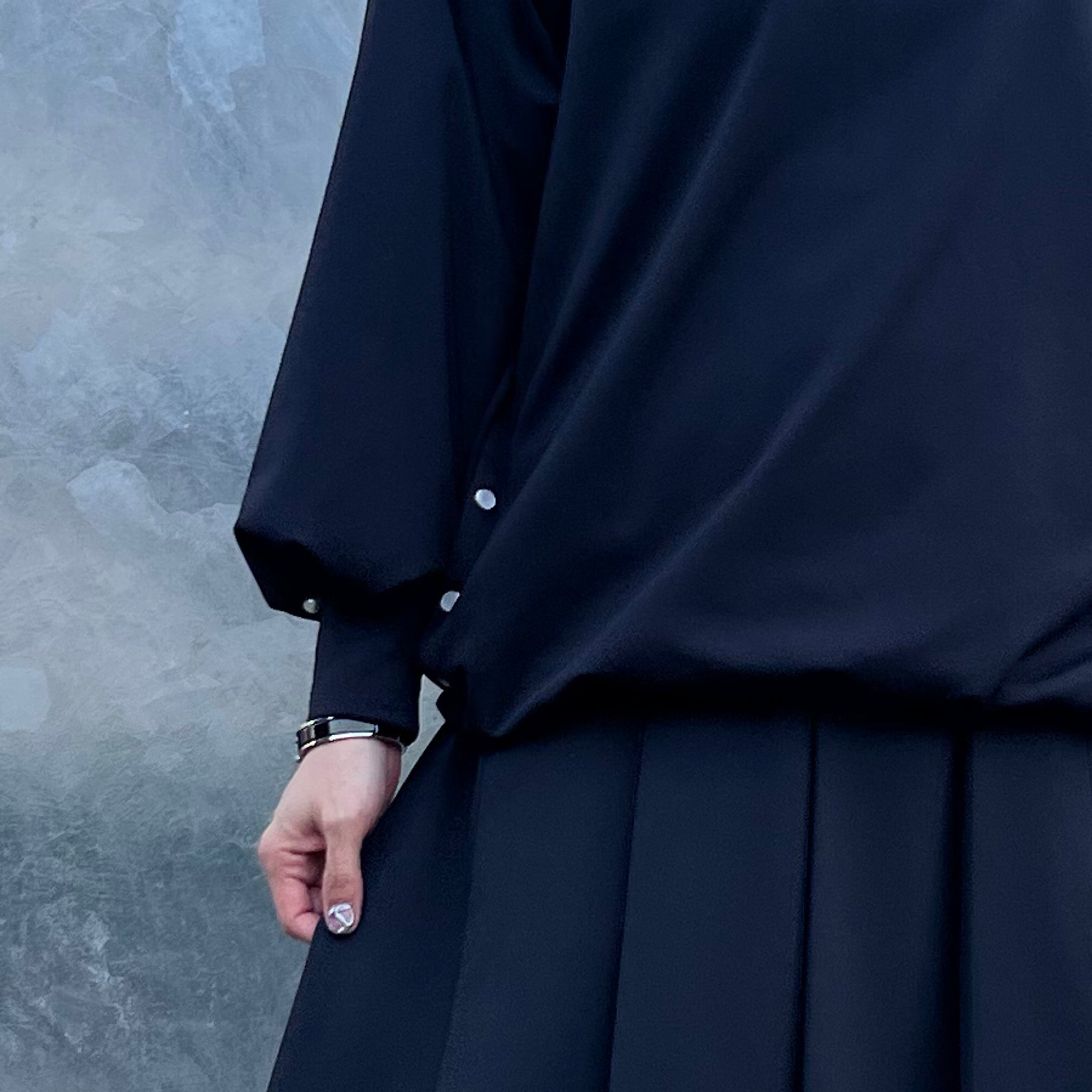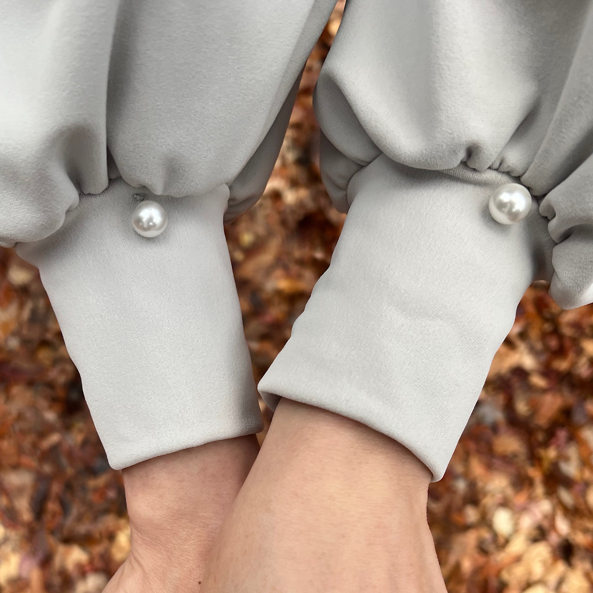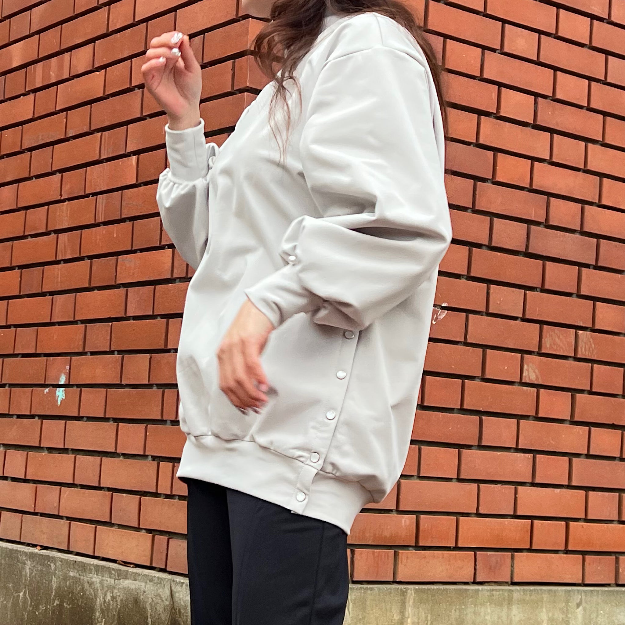 両脇にはパールモチーフのスナップボタンを配置し、