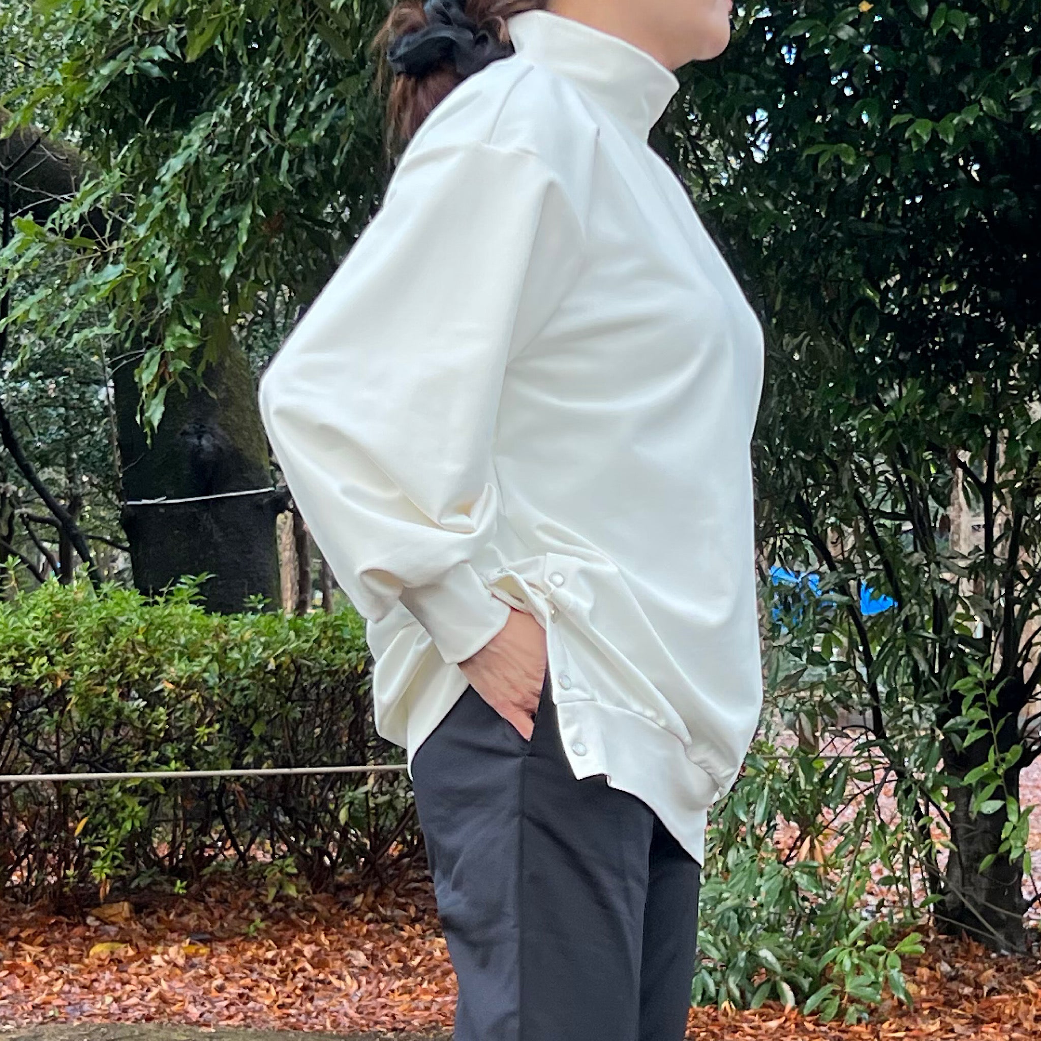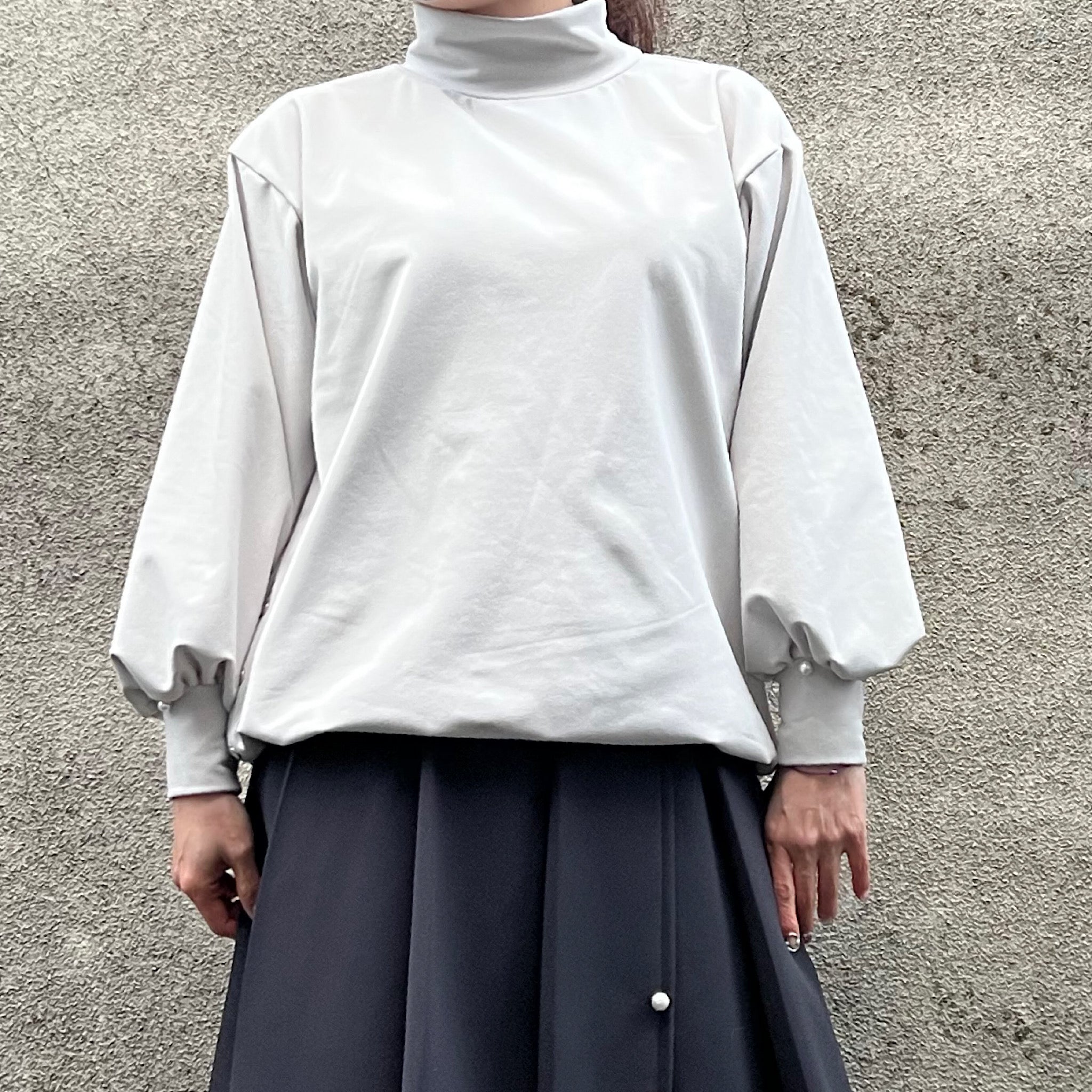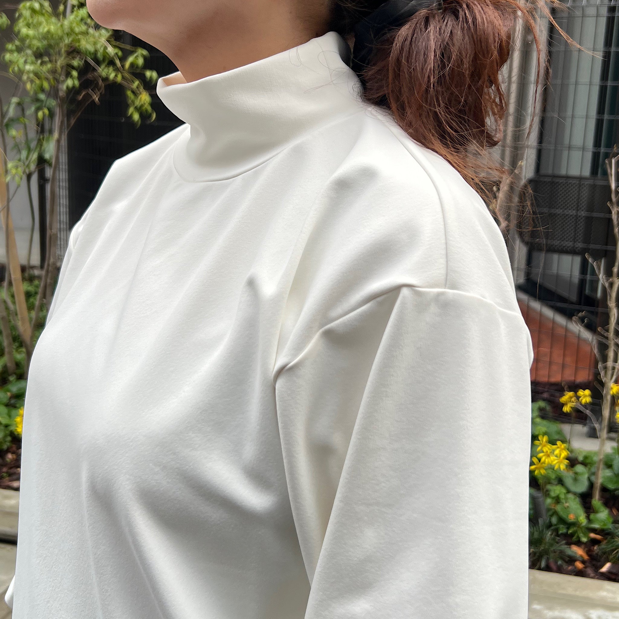 ハイネックは首元にやさしく沿う設計で、