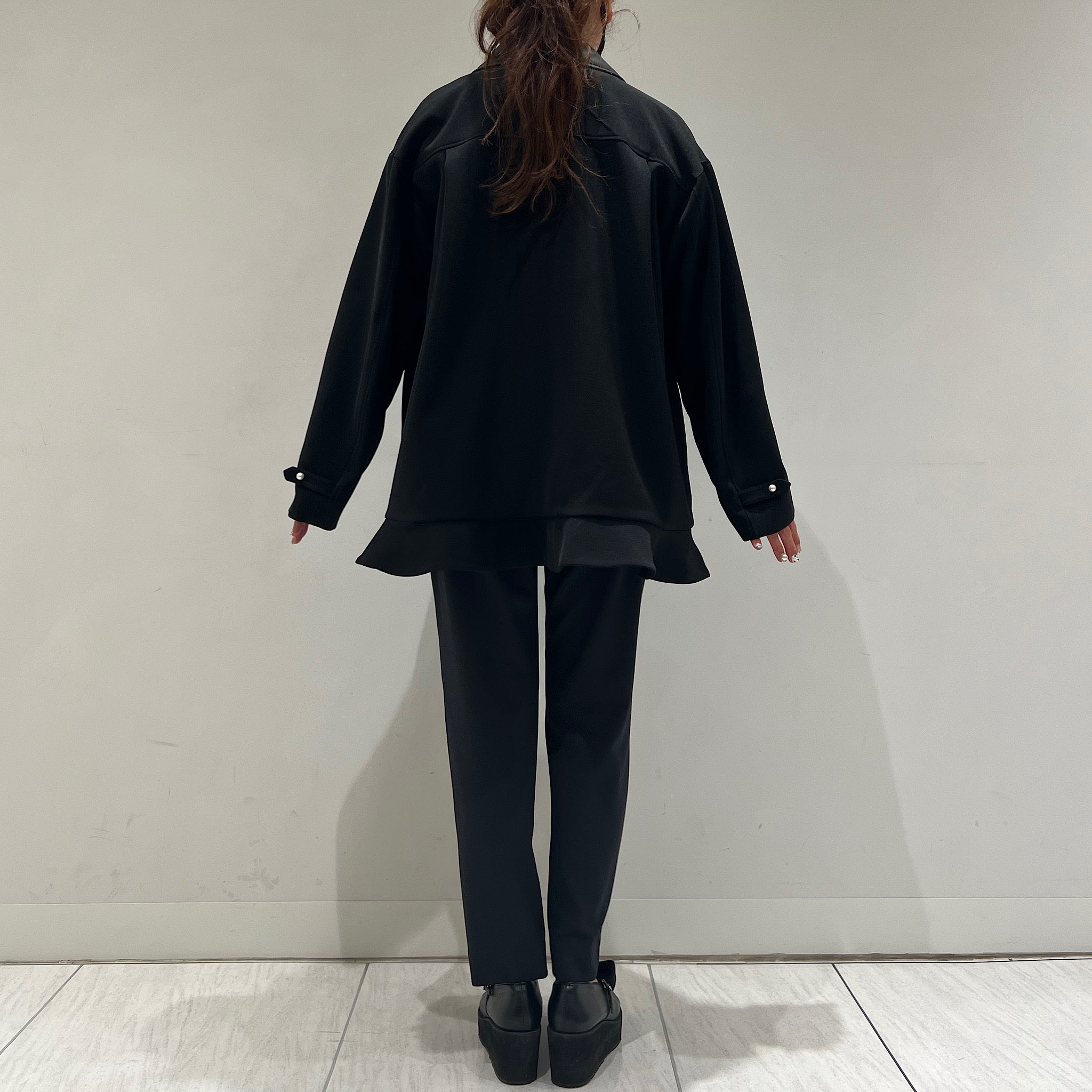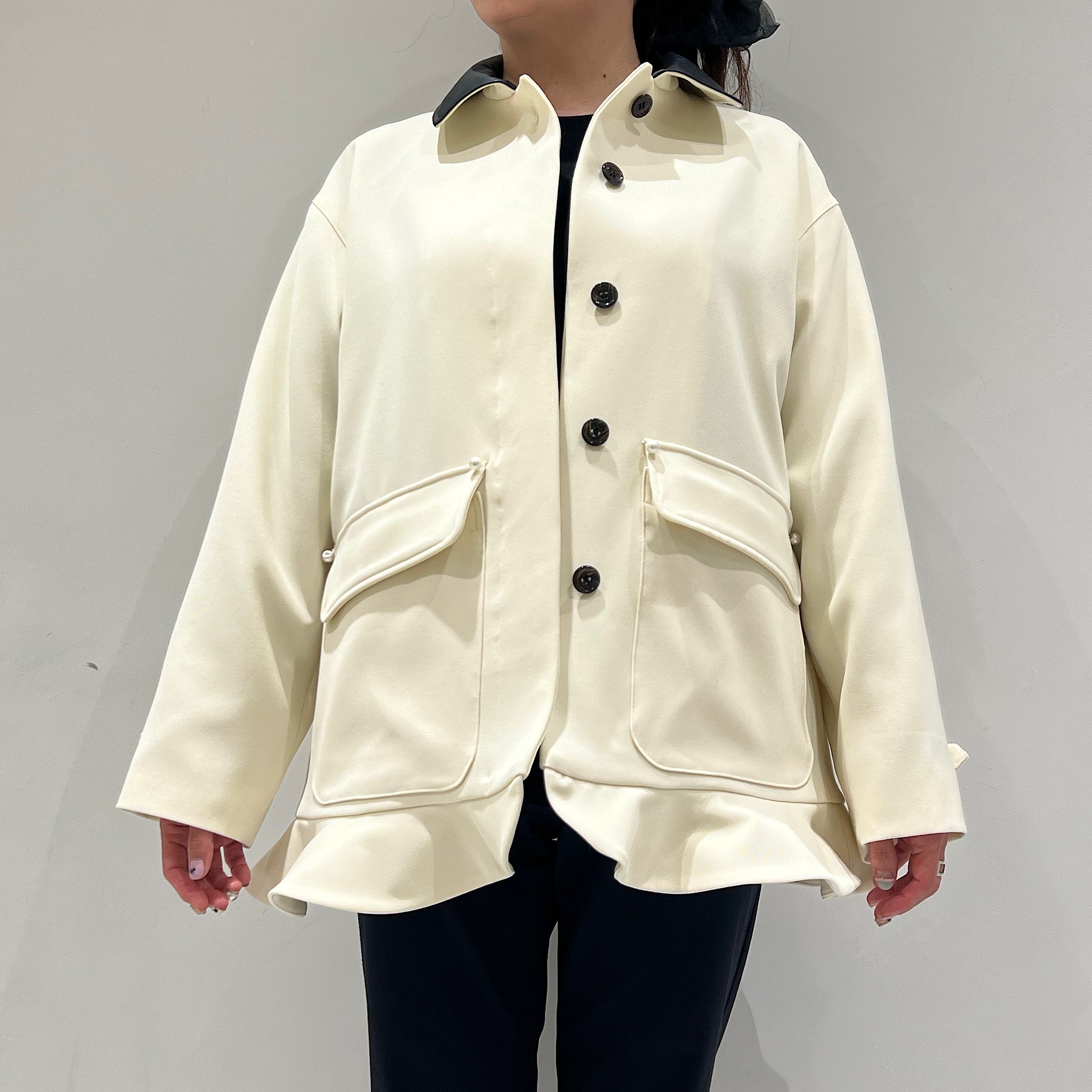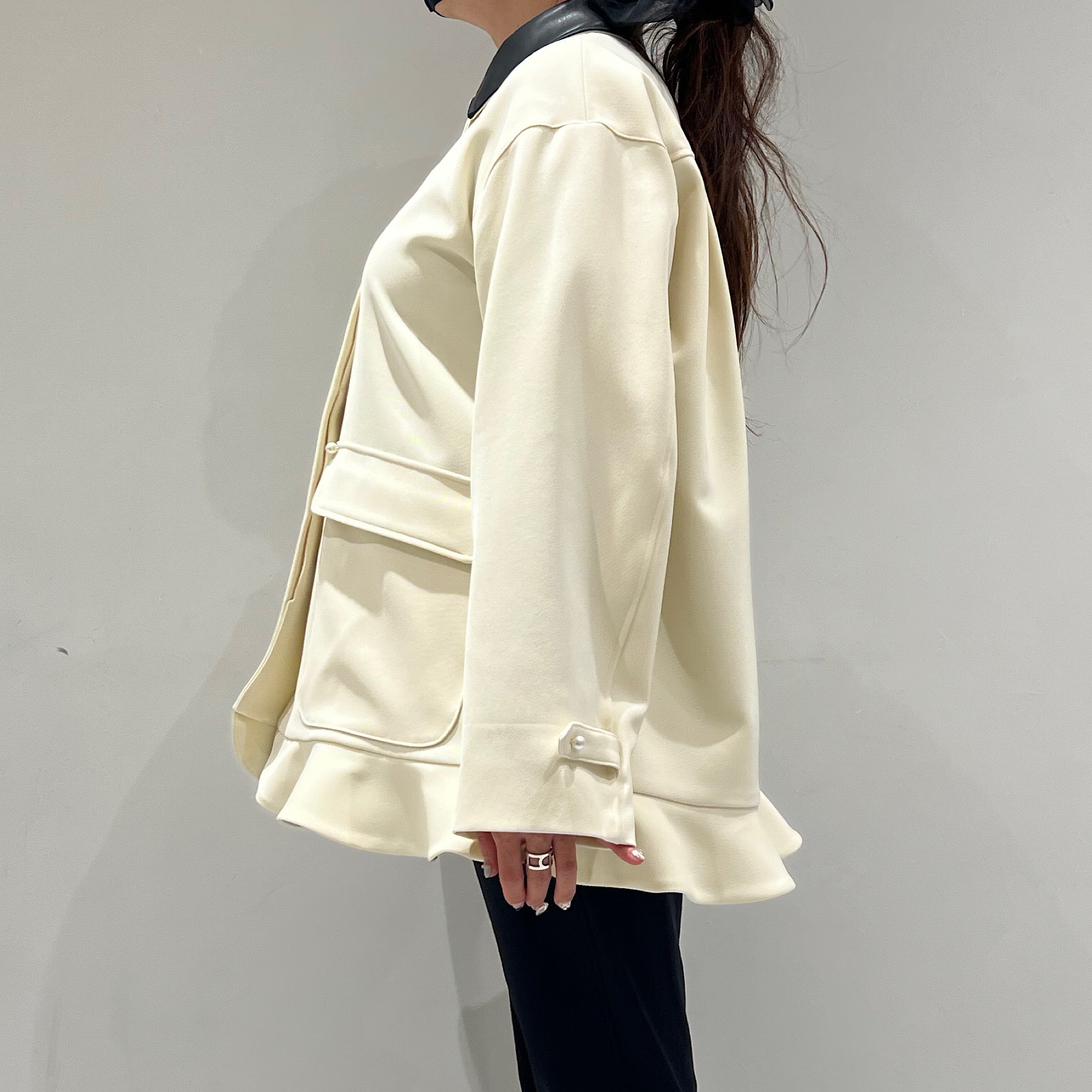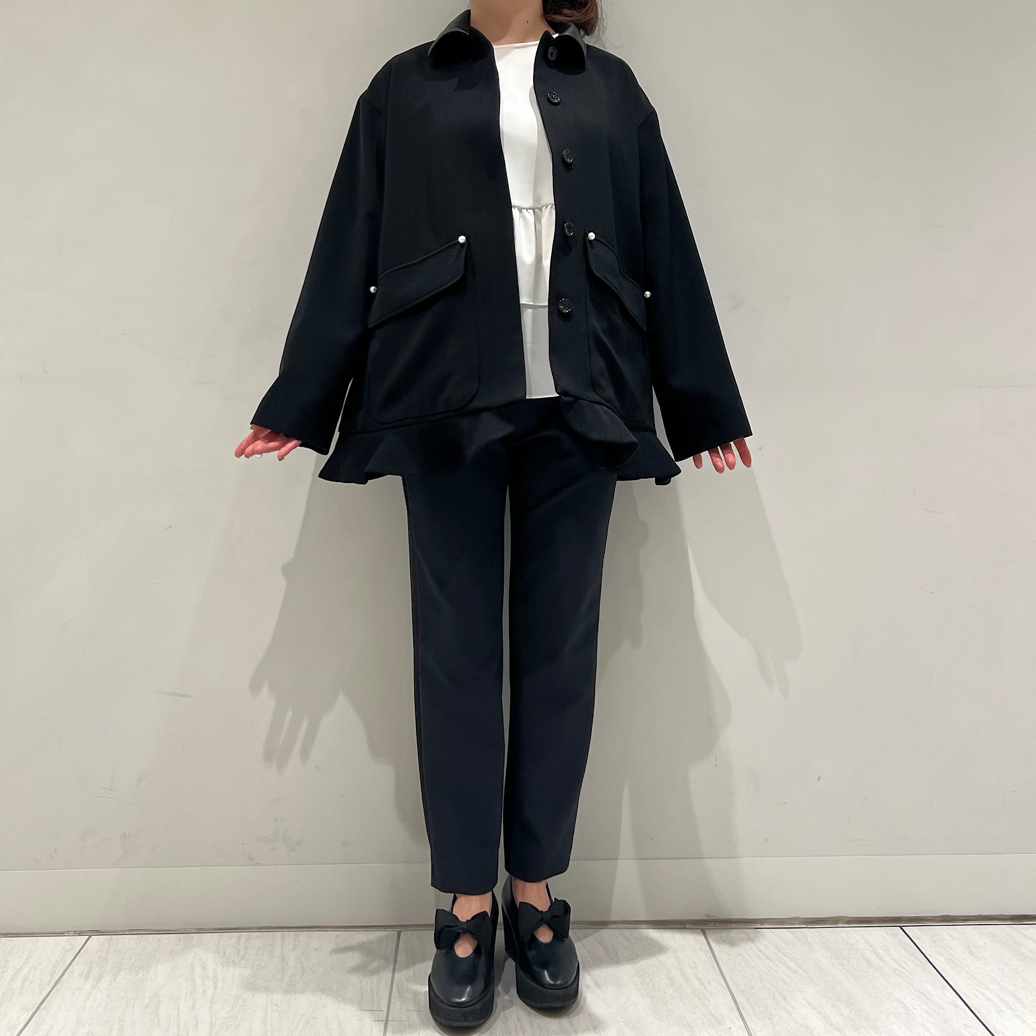 そこにパールボタンと裾のミニペプラムを効かせることで、