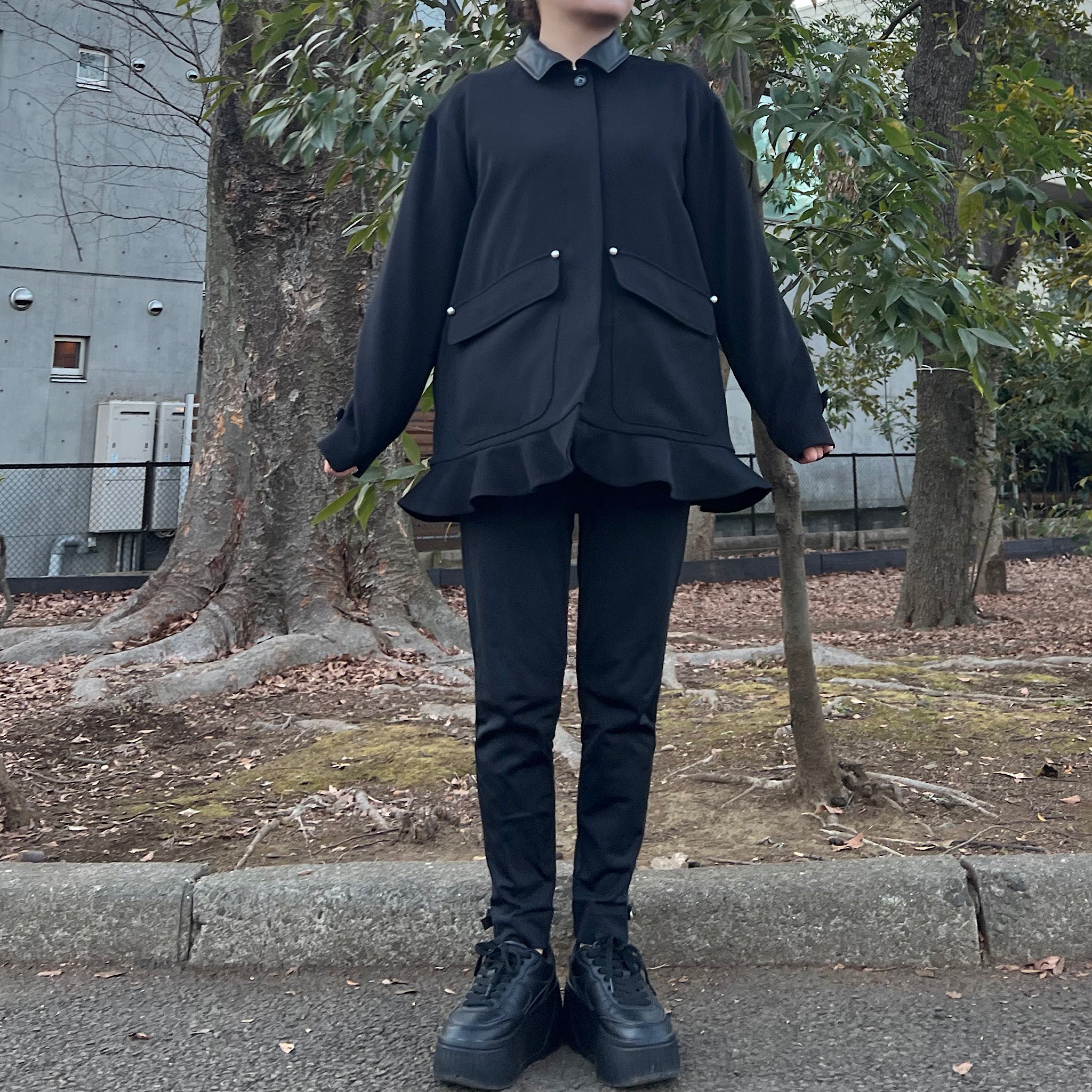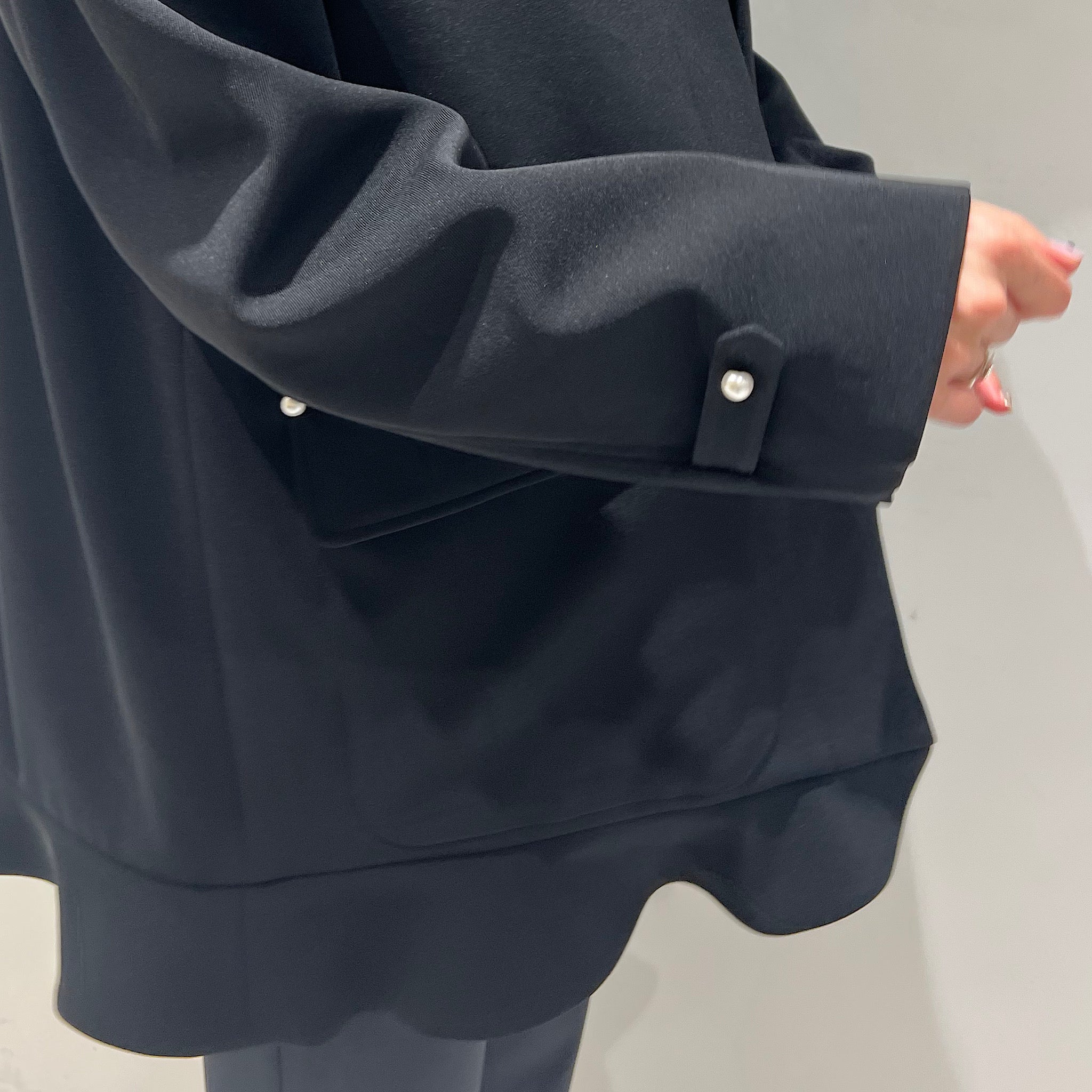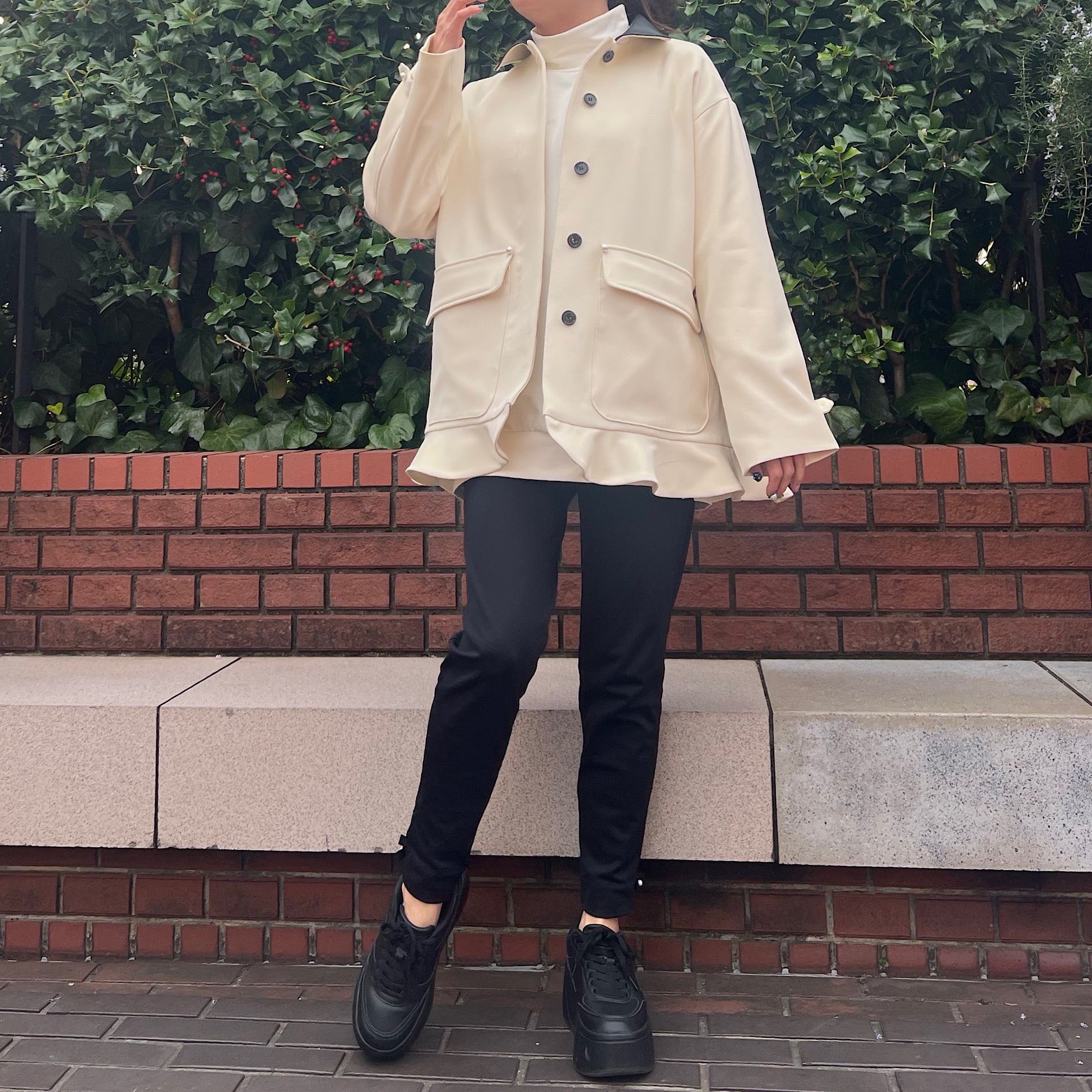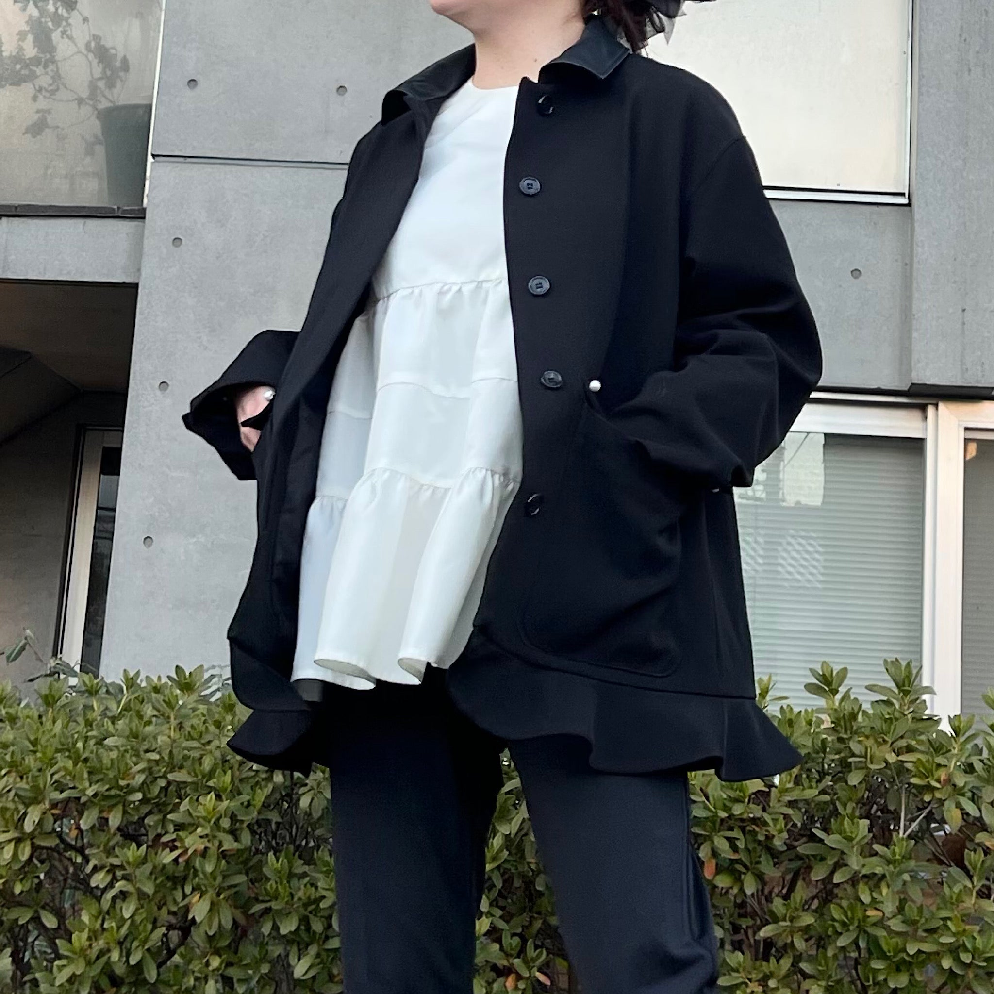 そこにパールボタンと裾のミニペプラムを効かせることで、